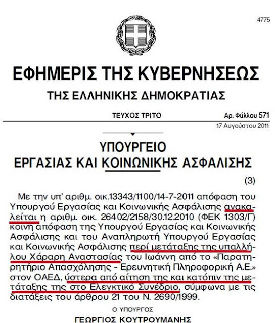 Γιατί όμως έγινε η μετάταξη στον ΟΑΕΔ, από το "Παρατητηρήριο Α.Ε.";